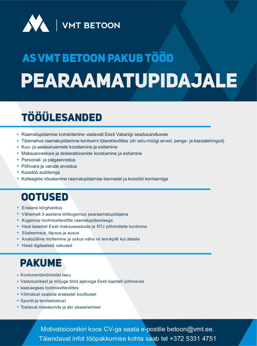 AS VMT Betoon pakub tööd Pearaamatupidajale